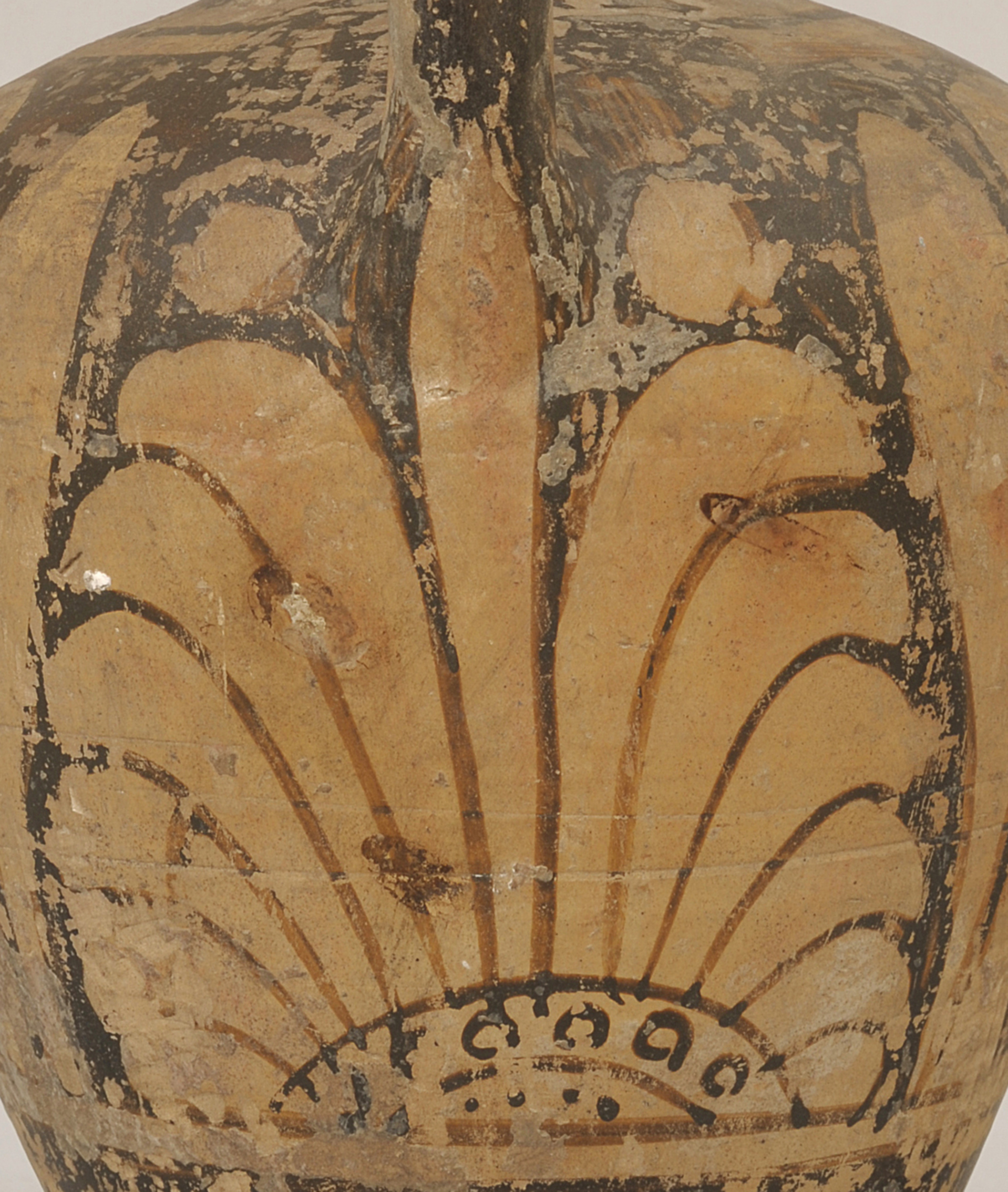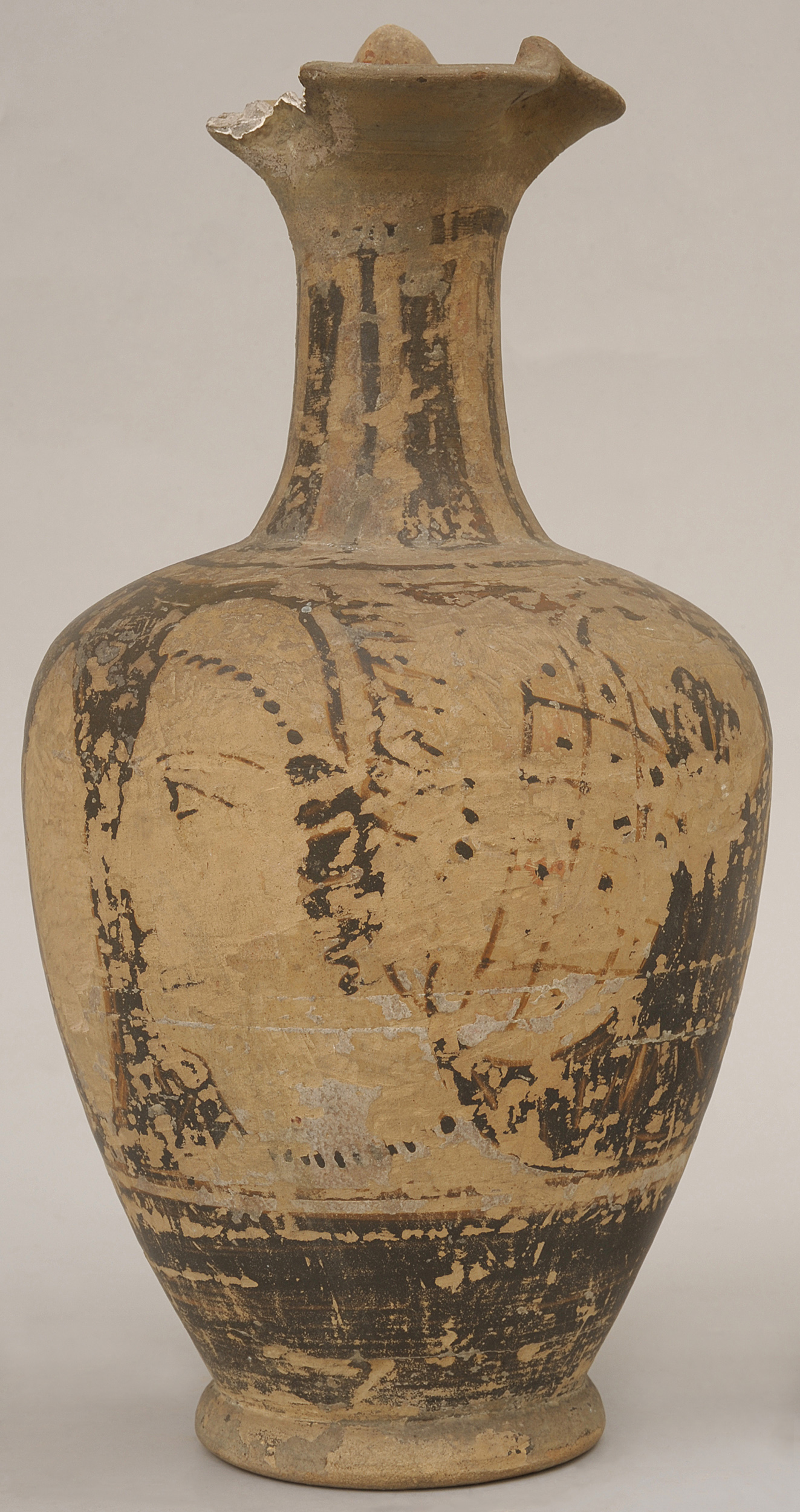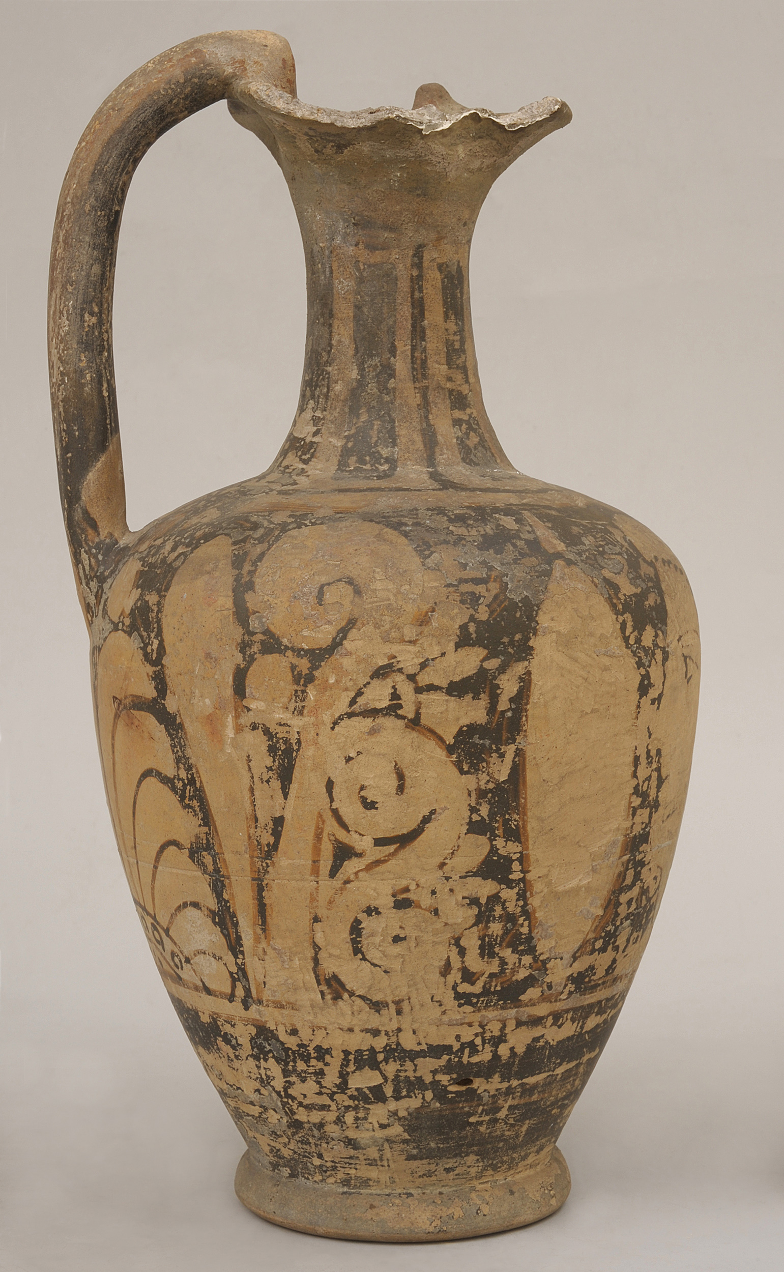 Dzban o szerokim wylewie i długiej, wąskiej szyjce wykonany z beżowej gliny. Ten typ naczynia nazywano oinochoe – służyło ono do czerpania wina z krateru (większego naczynia przeznaczonego do mieszania wina z wodą), a także do nalewania napoju do czar biesiadników. Wilanowski zabytek ozdobiono w technice czerwonofigurowej – pojawia się na nim przedstawienie głowy kobiecej ukazanej w lewym profilu, przed którą znajduje się duży, jasny przedmiot. Prawdopodobnie dama przystrojona w korale, diadem i wzorzystą chustę na włosach, przegląda się w lustrze. Dekorację figuralną uzupełnia palmeta i wici roślinne umieszczone pod uchwytem.